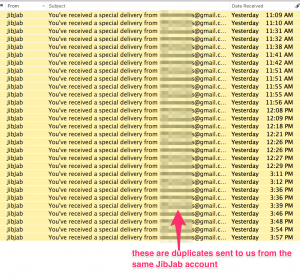 As an example of JibJab’s ineptness, here is a copy of our inbox for one day: